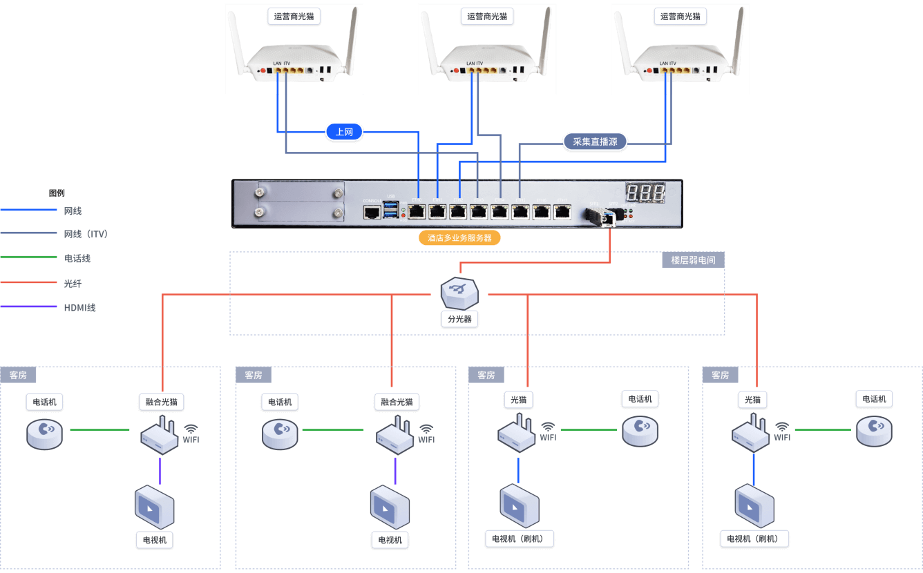 机房一台酒店多业务服务器,楼层只需分光器,一房一光纤一光猫。