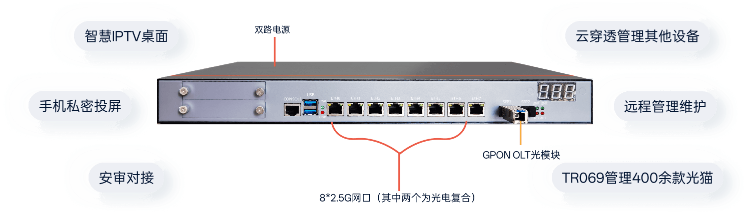 一台酒店多业务服务器支持接入64个光猫或融合光猫(带机顶盒的光猫),为酒店提供宽带上网、安审对接、PON组网、WiFi覆盖/漫游、内线电话、智慧IPTV、私密投屏等融合业务。