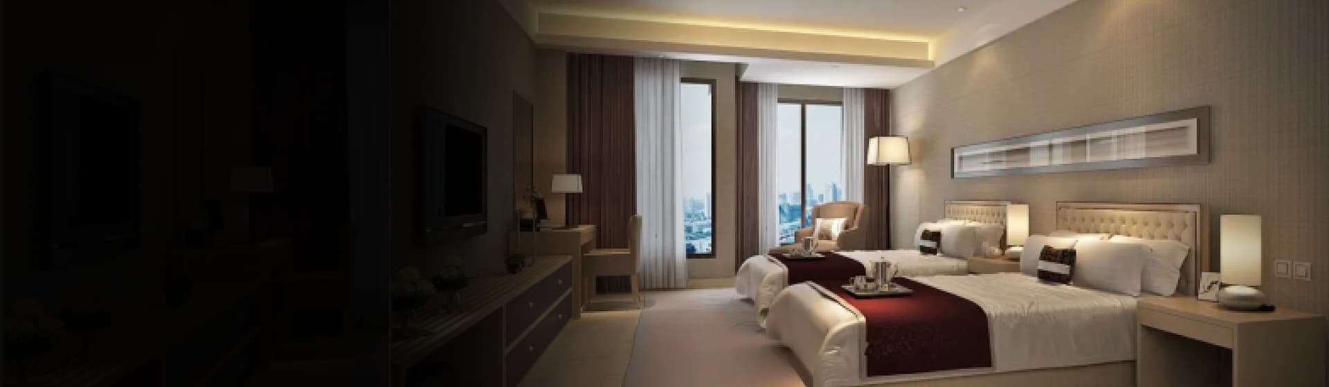 电视关闭,窗帘关闭,灯光熄灭,为您营造一个好的睡眠环境,像在家里一样踏实