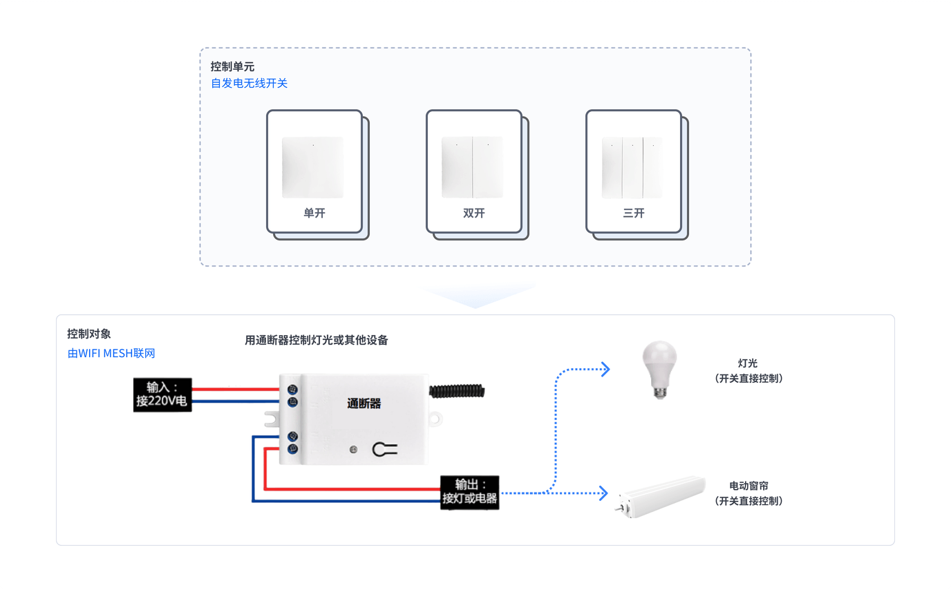 WiFi自组网连接,无需重新布线,只需更换开关面板就可以完成改造。