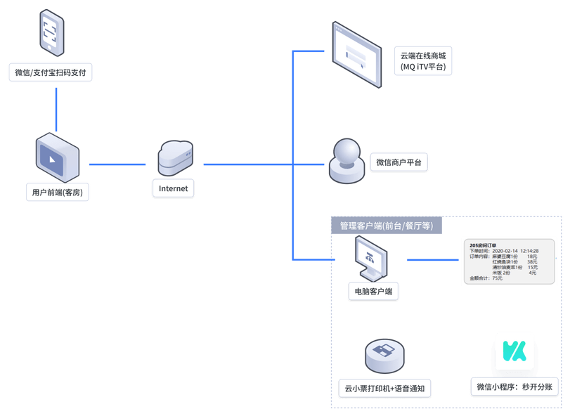 假设酒店与餐馆进行二八分账,即酒店占20%收款占比,餐馆占80%的收款占比。如客户点餐金额为100元,则平台收取3元管理费(100*3%),余额97元由系统按二八比例自动分配给二个收款人,酒店收入是19.4元(97*20%),餐馆收入是77.6元(97*80%)。