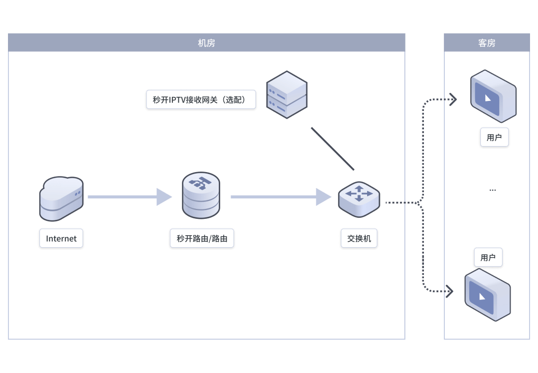 采用秒开路由系统或融合网关对直播源进行接收和转发,节省带宽,换台迅速。