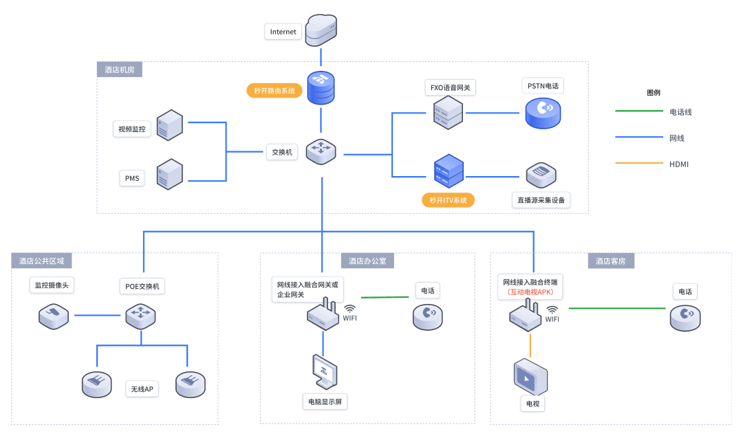 机房到各房间以及各信息接入点全部采用网络连接,机房端采用交换机,客房终端采用网线接入融合网关,办公室采用企业网关。
